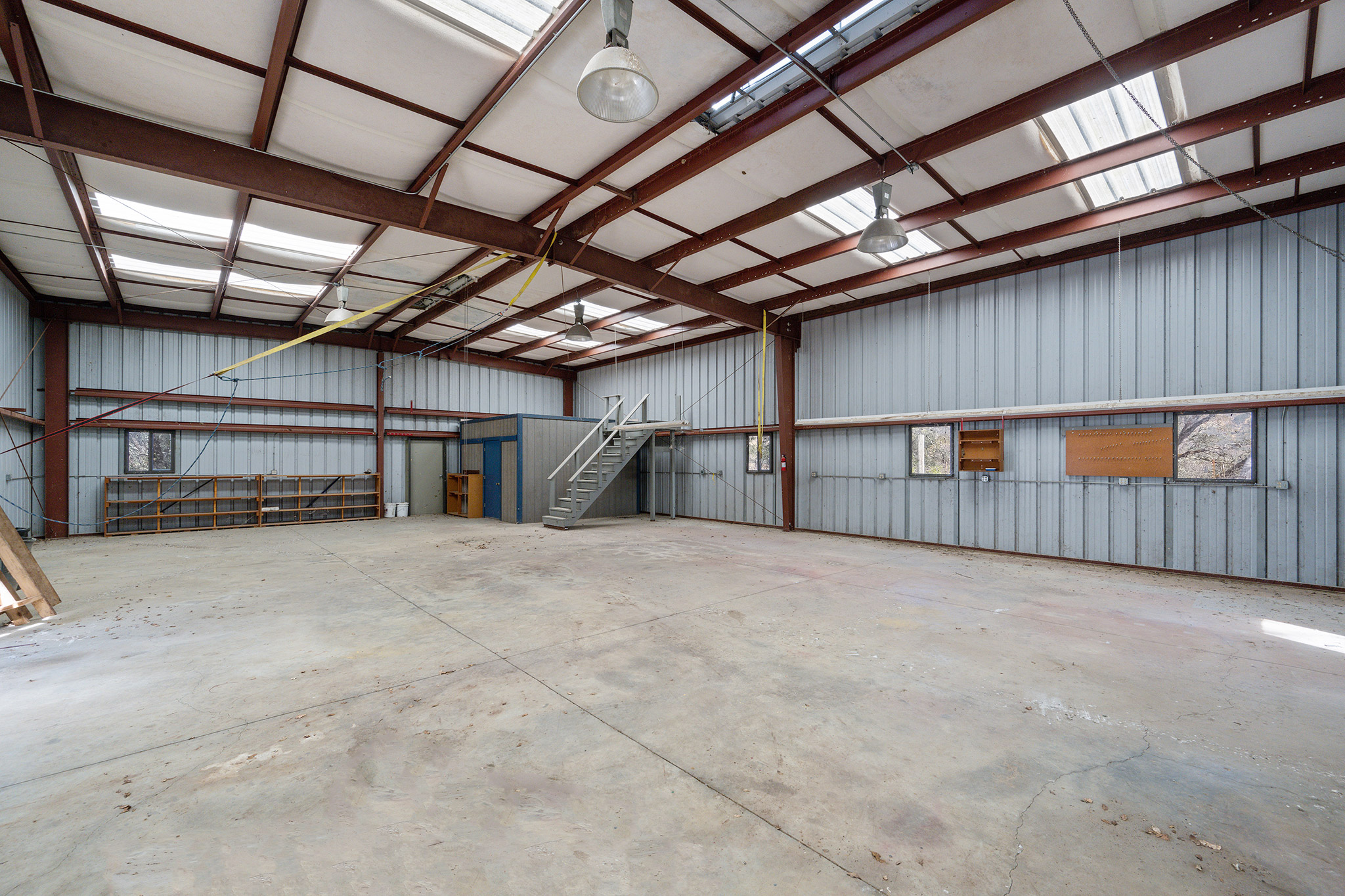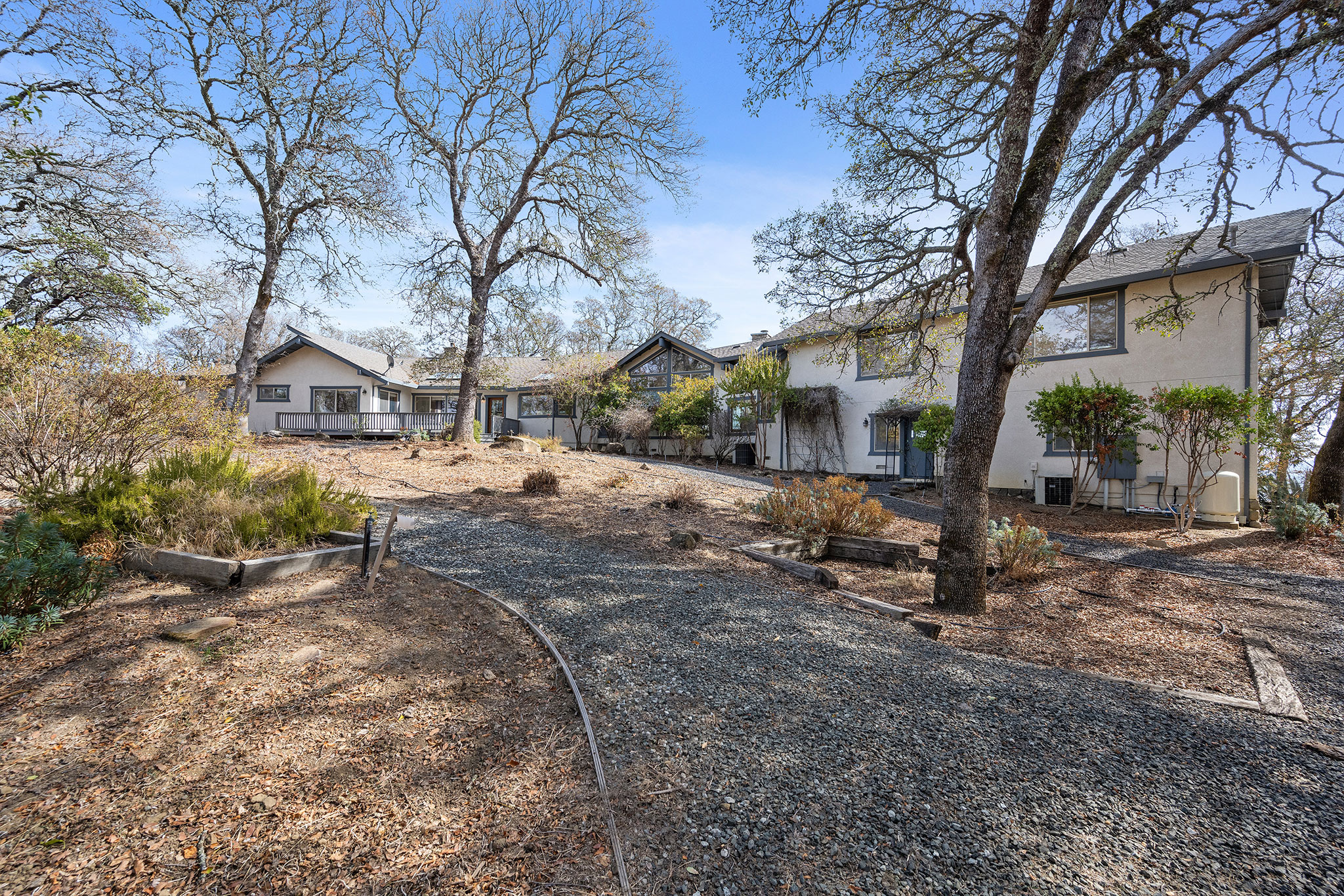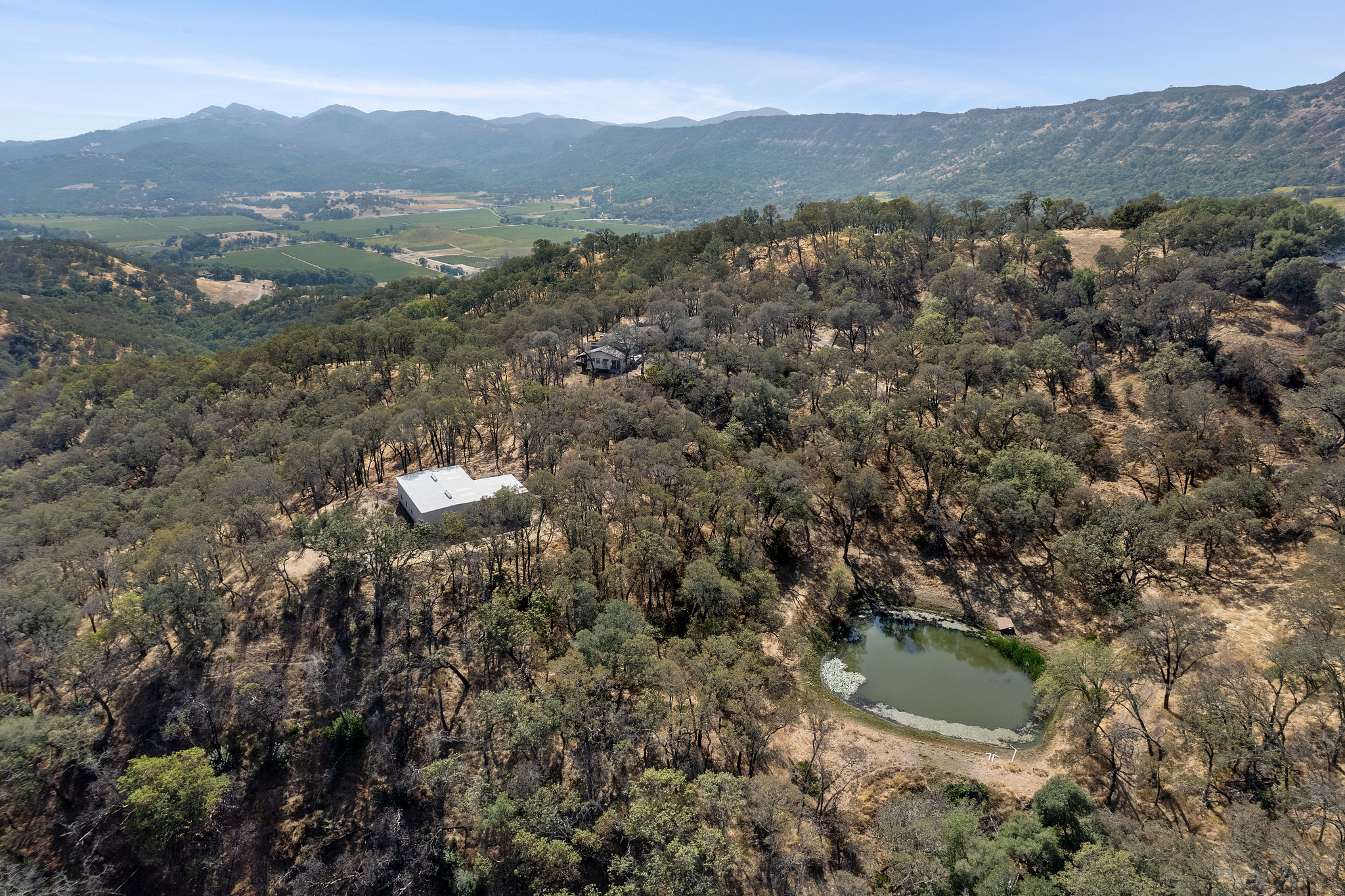 Spacious living room with cathedral ceiling and fan, valley views at the front, and entire wall of stone with integrated fireplace