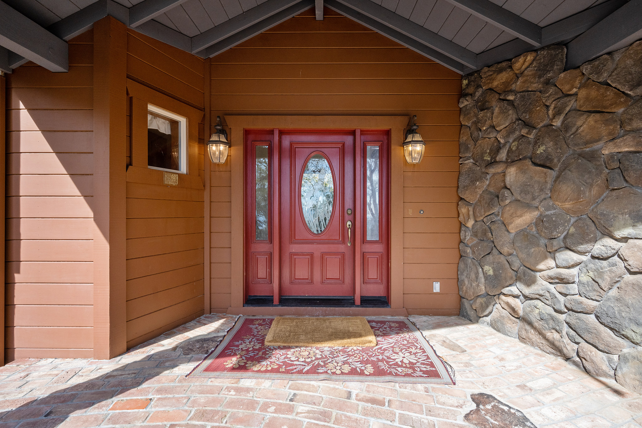 Stone-clad front portico shelters the front door and sidelights, all with inlaid leaded glass
