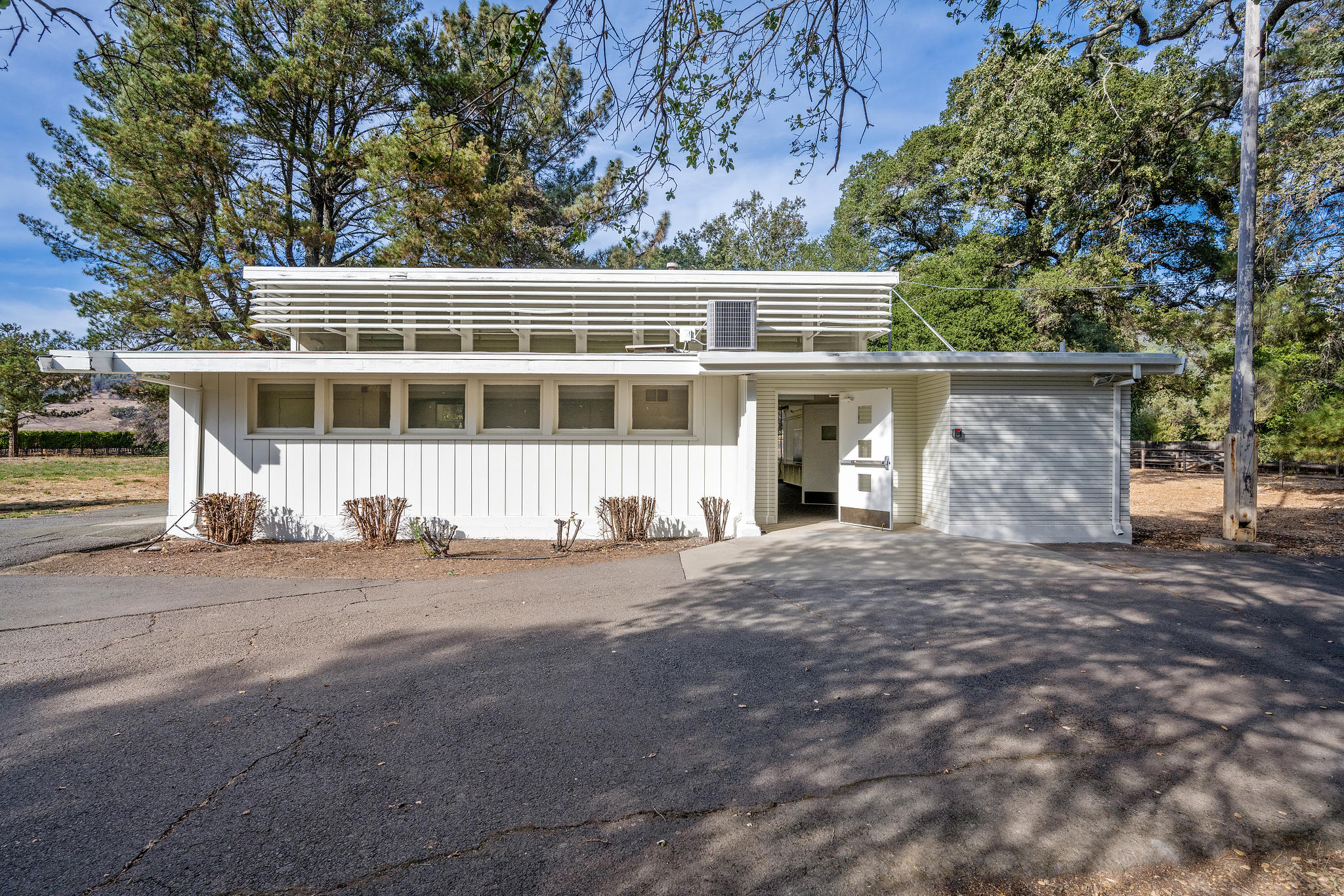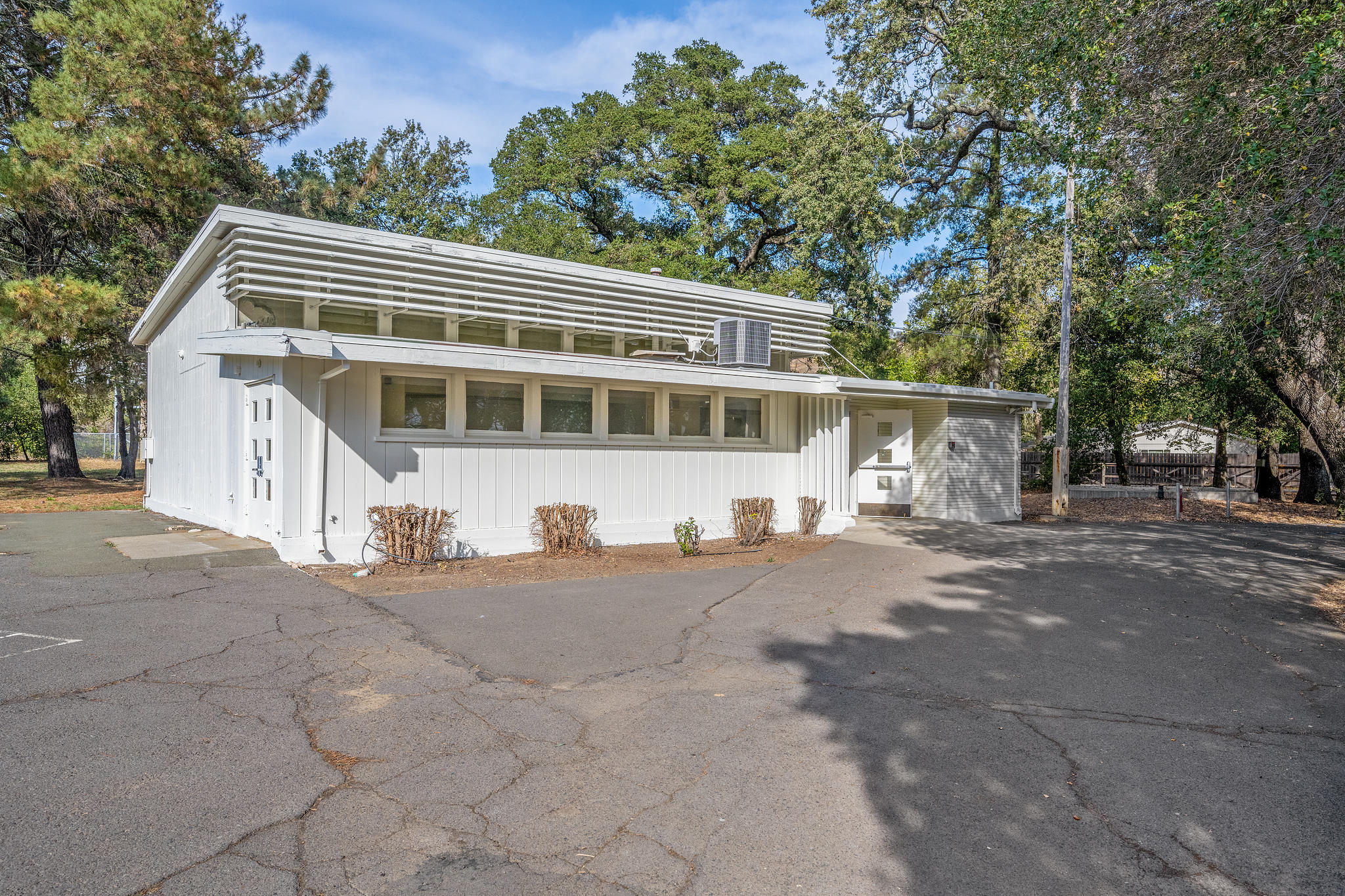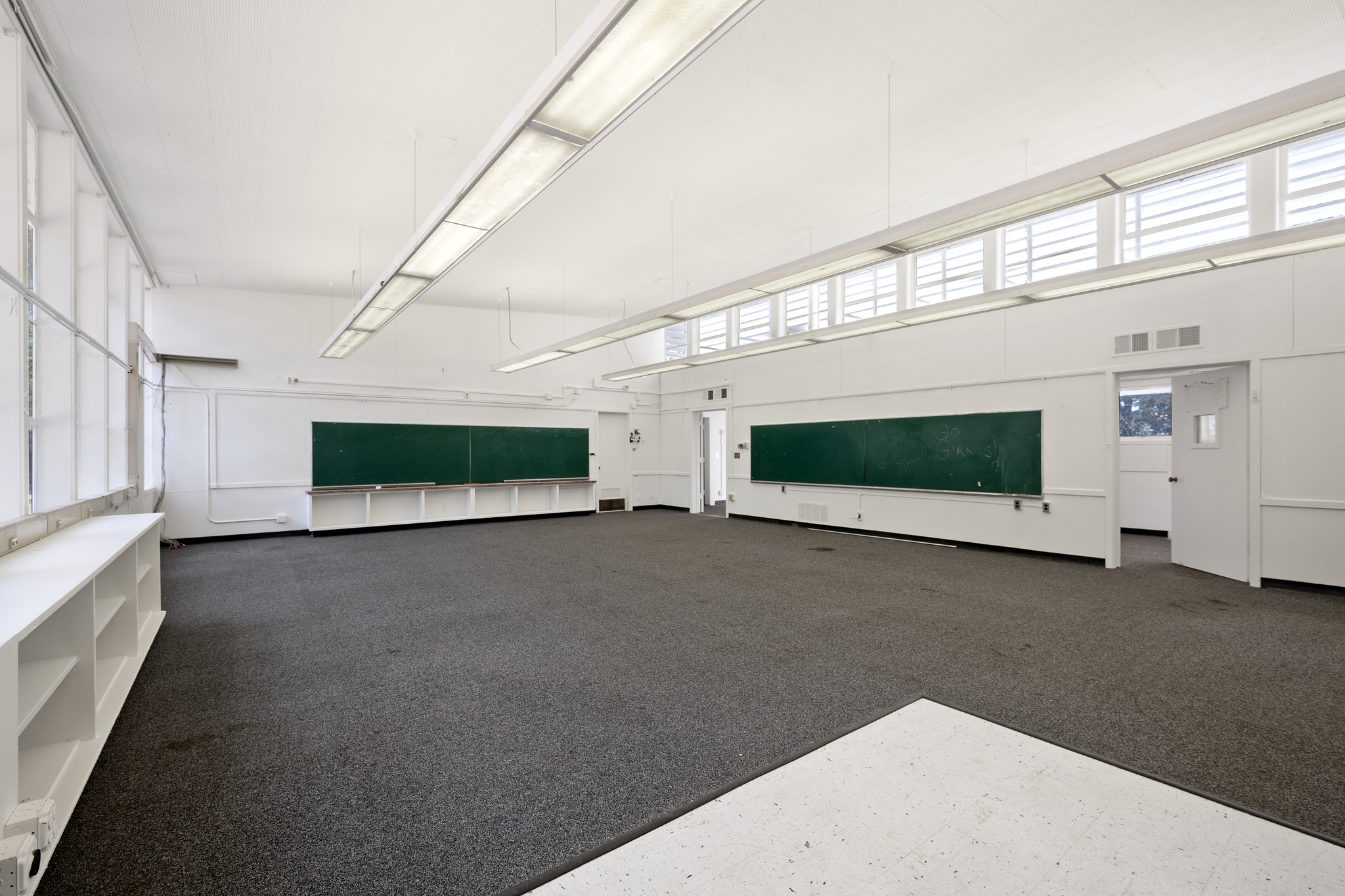 - Two main rooms, currently set up as classrooms with chalk boards, side-by-side windows, and row of side-by-side clerestory windows in one room
